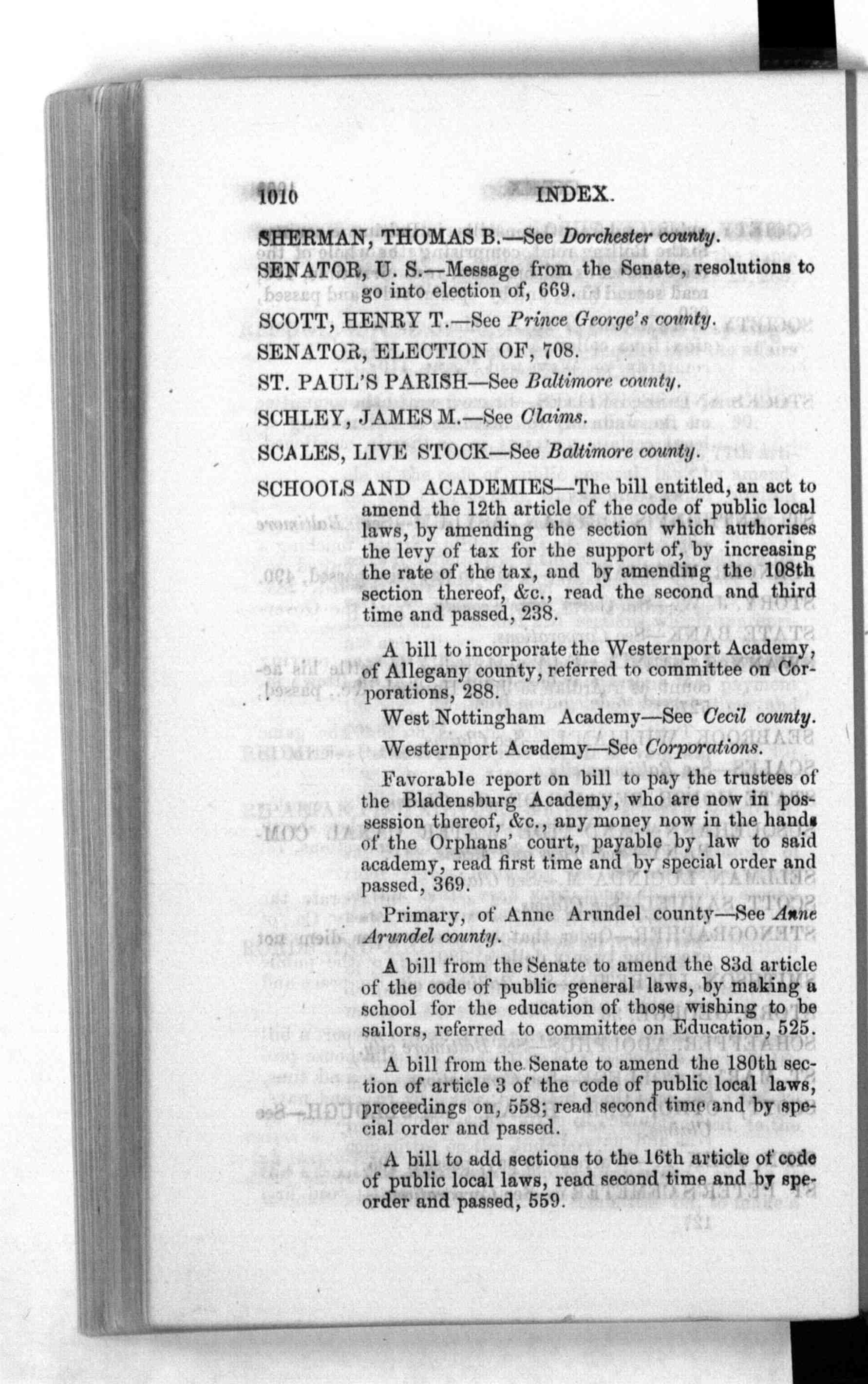 1010 INDEX. SHERMAN, THOMAS B.—See Dorchester county. SENATOR, U. S.—Message from the Senate, resolutions to SCOTT, HENRY T.—See Prince George's county. SENATOR, ELECTION OF, 708. ST. PAUL'S PARISH—See Baltimore county. SCHLEY, JAMES M.—See Claims. SCALES, LIVE STOCK—See Baltimore county. SCHOOLS AND ACADEMIES—The bill entitled, an act to A bill to incorporate the Westernport Academy, West Nottingham Academy—See Cecil county. Westernport Academy—See Corporations. Favorable report on bill to pay the trustees of Primary, of Anne Arundel county—See Anne A bill from the Senate to amend the 83d article A bill from the Senate to amend the 180th sec- A bill to add sections to the 16th article of code |