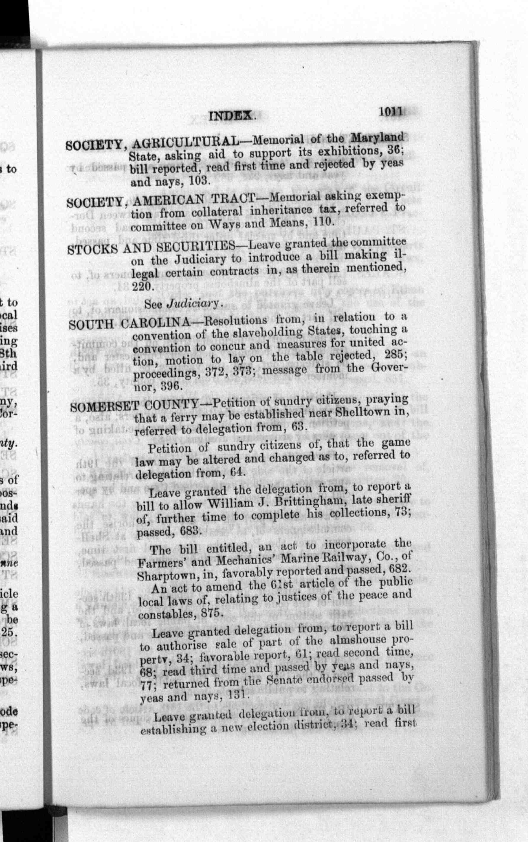 INDEX. 1011 SOCIETY, AGRICULTURAL—Memorial of the Maryland State, asking aid to support its exhibitions, 36; SOCIETY, AMERICAN TRACT—Memorial asking exemp- STOCKS AND SECURITIES—Leave granted the committee See Judiciary. SOUTH CAROLINA—Resolutions from, in relation to a SOMERSET COUNTY—Petition of sundry citizens, praying Petition of sundry citizens of, that the game Leave granted the delegation from, to report a The bill entitled, an act to incorporate the An act to amend the 61st article of the public Leave granted delegation from, to report, a bill Leave granted delegation from, to report a bill |