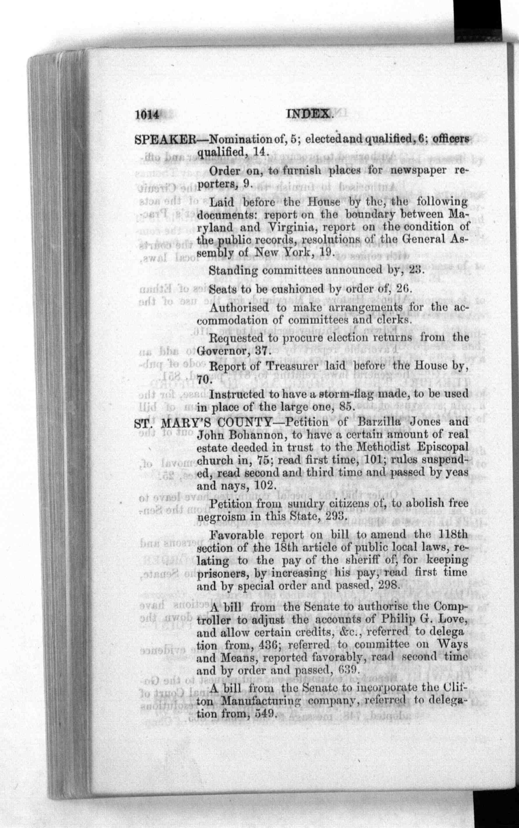 1014 INDEX. SPEAKER—Nomination of, 5; elected and qualified, 6; officers Order on, to furnish places for newspaper re- Laid before the House by the, the following Standing committees announced by, 23. Authorised to make arrangements for the ac- Requested to procure election returns from the Report of Treasurer laid before the House by, Instructed to have a storm-flag made, to be used ST. MARY'S COUNTY—Petition of Barzilla Jones and estate deeded in trust to the Methodist Episcopal Petition from sundry citizens of, to abolish free Favorable report on bill to amend the 118th A bill from the Senate to authorise the Comp- A bill from the Semite to incorporate the Clif- |