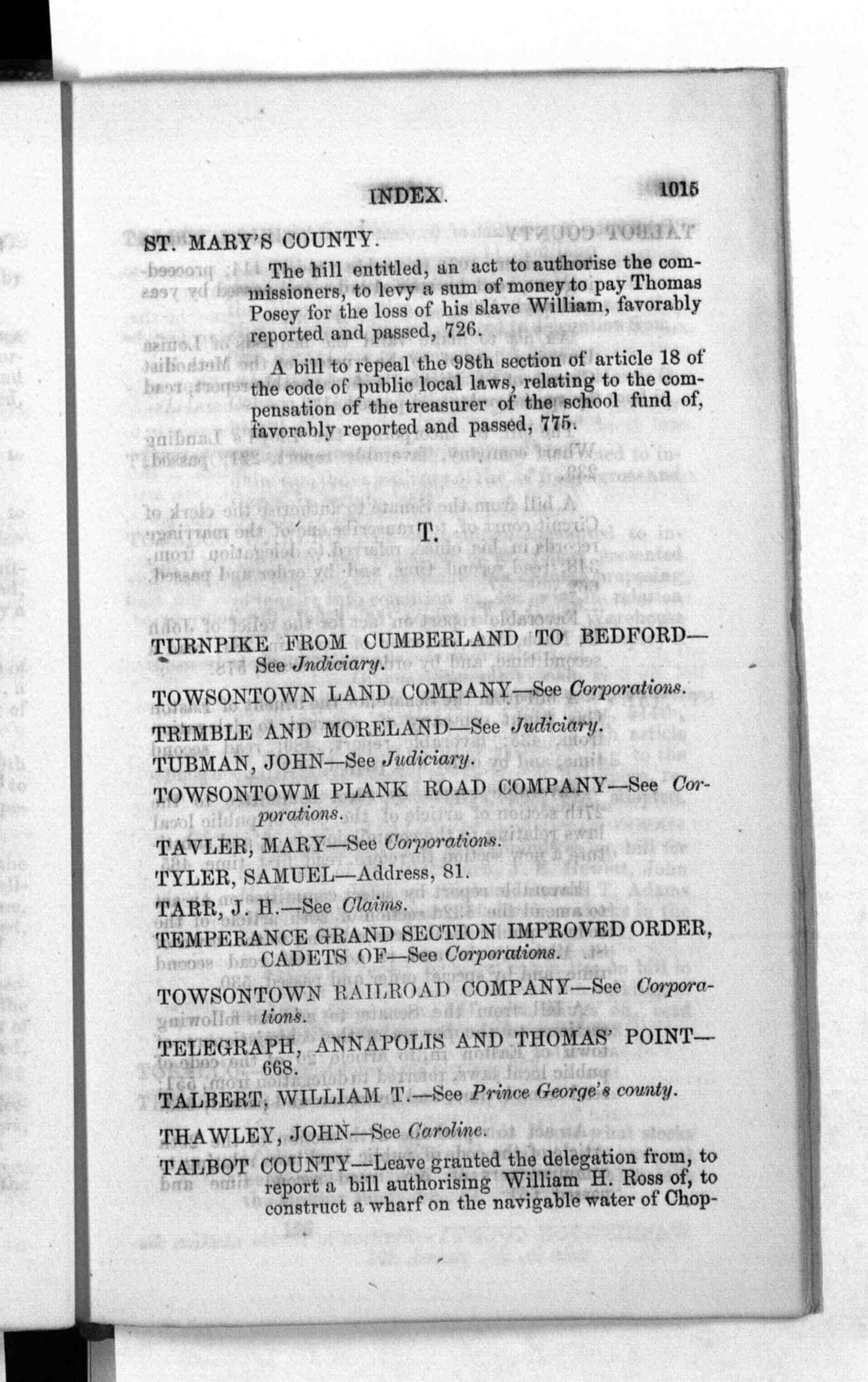 INDEX. 1015 ST. MARY'S COUNTY. The bill entitled, an act to authorise the com- A bill to repeal the 98th section of article 18 of T. TURNPIKE FROM CUMBERLAND TO BEDFORD— TOWSONTOWN LAND COMPANY—See Corporations. TRIMBLE AND MORELAND—See Judiciary. TOWSONTOWN PLANK ROAD COMPANY—See Cor- TAVLER, MARY—See Corporations. TEMPERANCE GRAND SECTION IMPROVED ORDER, TOWSONTOWN RAILROAD COMPANY—See Corpora- tions. TELEGRAPH, ANNAPOLIS AND THOMAS' POINT— 668. TALBERT, WILLIAM T.—See Prince George's county. THAWLEY, JOHN—See Caroline. TALBOT COUNTY—Leave granted the delegation from, to |
