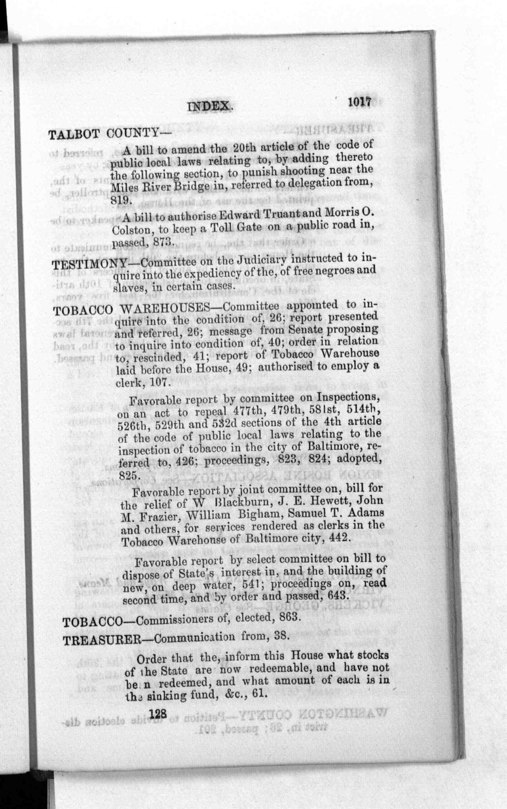 INDEX. 1017 TALBOT COUNTY— A bill to amend the 20th article of the code of public local laws relating to, by adding thereto the following section, to punish shooting near the Miles River Bridge in, referred to delegation from, 819. A bill to authorise Edward Truant and Morris O. TESTIMONY—Committee on the Judiciary instructed to in- TOBACCO WAREHOUSES—Committee appointed to in- Favorable report by committee on Inspections, Favorable report by joint committee on, bill for Favorable report by select committee on bill to TOBACCO—Commissioners of, elected, 863. Order that the, inform this House what stocks |