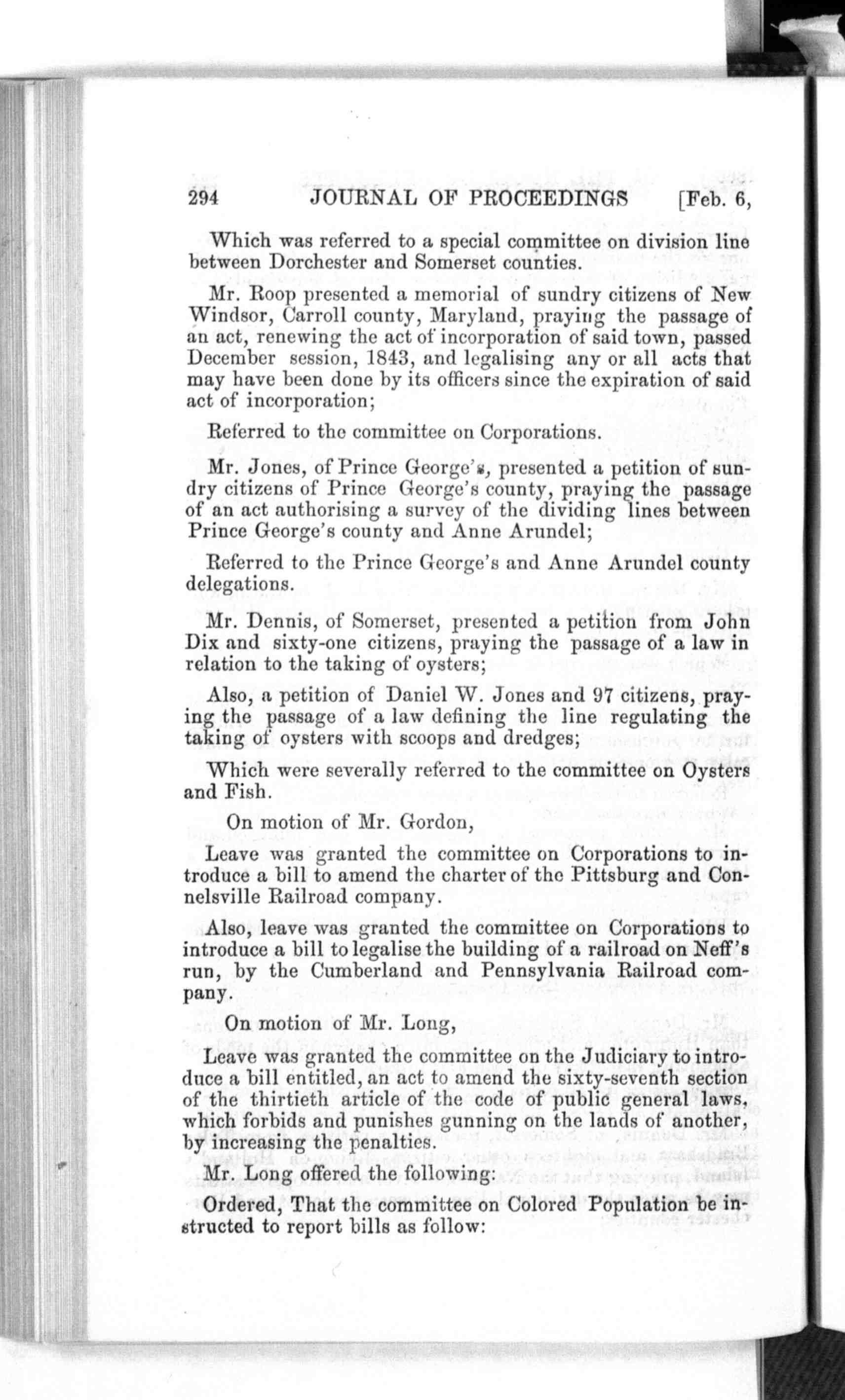 294 JOURNAL OF PROCEEDINGS [Feb. 6, Which was referred to a special committee on division line Mr. Hoop presented a memorial of sundry citizens of New Referred to the committee on Corporations. Mr. Jones, of Prince George's, presented a petition of sun- Referred to the Prince George's and Anne Arundel county Mr. Dennis, of Somerset, presented a petition from John Also, a petition of Daniel W. Jones and 97 citizens, pray- Which were severally referred to the committee on Oysters On motion of Mr. Gordon, Leave was granted the committee on Corporations to in- Also, leave was granted the committee on Corporations to On motion of Mr. Long, Leave was granted the committee on the Judiciary to intro- Mr. Long offered the following: Ordered, That the committee on Colored Population be in- |