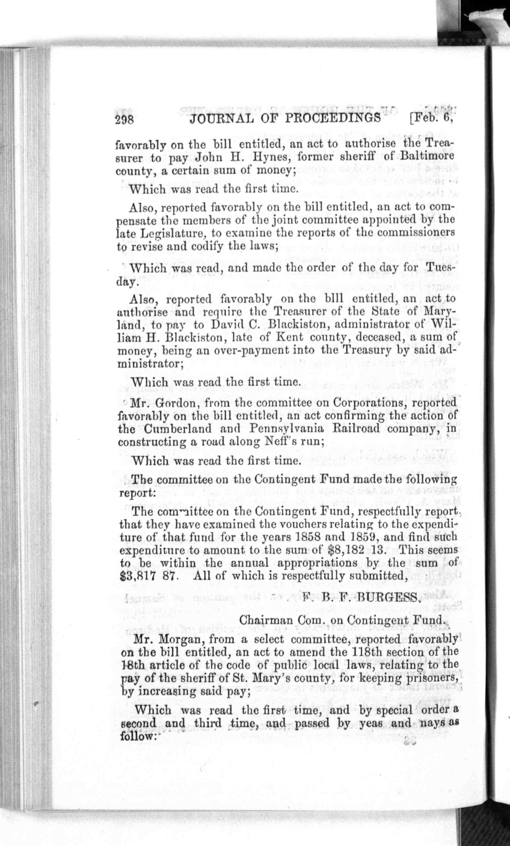 298 JOURNAL OF PROCEEDINGS [Feb. 6, favorably on the bill entitled, an act to authorise the Trea- Which was read the first time. Also, reported favorably on the bill entitled, an act to com- Which was read, and made the order of the day for Tues- Also, reported favorably on the bill entitled, an act to Which was read the first time. Mr. Gordon, from the committee on Corporations, reported Which was read the first time. The committee on the Contingent Fund made the following The committee on the Contingent Fund, respectfully report, F. B. F. BURGESS, Chairman Com. on Contingent Fund. Mr. Morgan, from a select committee, reported favorably Which was read the first time, and by special order a |