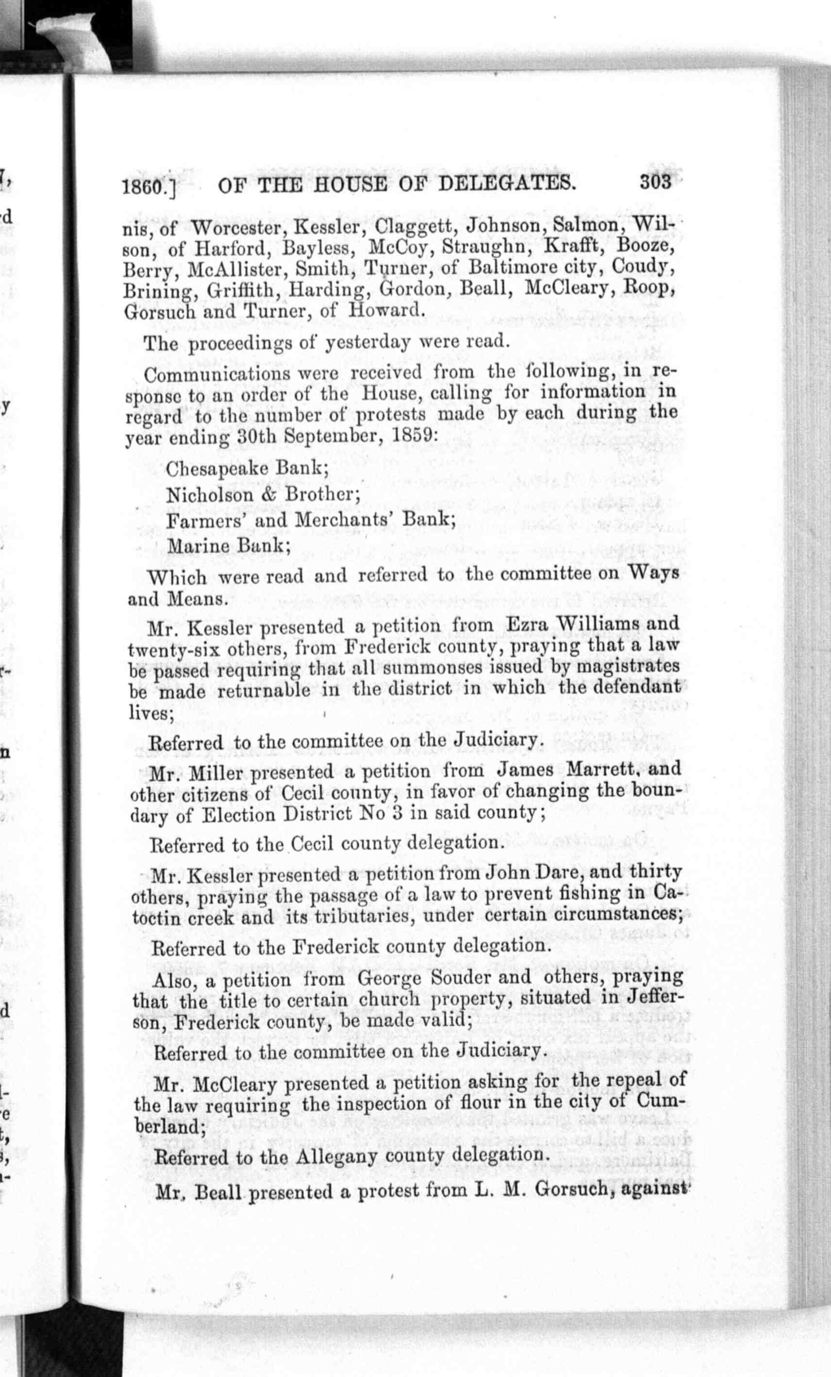 1860] OF THE HOUSE OF DELEGATES. 303 nis, of Worcester, Kessler, Claggett, Johnson, Salmon, Wil- The proceedings of yesterday were read. Communications were received from the following, in re- Chesapeake Bank; Which were read and referred to the committee on Ways Mr. Kessler presented a petition from Ezra Williams and Referred to the committee on the Judiciary. Mr. Miller presented a petition from James Marrett, and Referred to the Cecil county delegation. Mr. Kessler presented a petition from John Dare, and thirty Referred to the Frederick county delegation. Also, a petition from George Souder and others, praying Referred to the committee on the Judiciary. Mr. McCleary presented a petition asking for the repeal of Referred to the Allegany county delegation. Mr. Beall presented a protest from L. M. Gorsuch, against