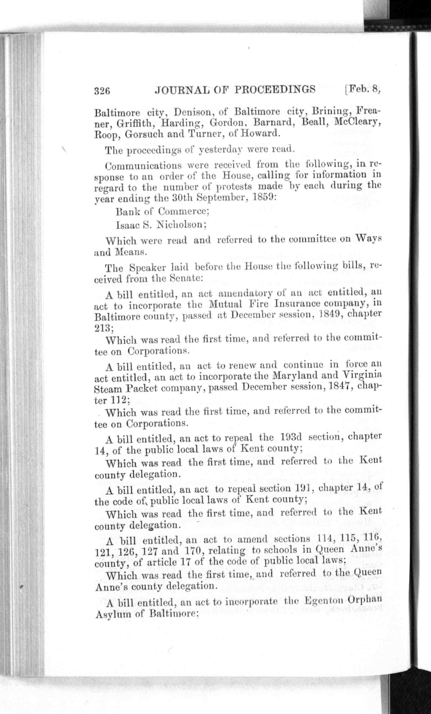 326 JOURNAL OF PROCEEDINGS [Feb. 8, Baltimore city, Denison, of Baltimore city, Brining, Frea- The proceedings of yesterday were read. Communications were received from the. following, in. re- Bank of Commerce; Isaac S. Nicholson; Which were read and referred to the committee on Ways The Speaker laid before this House the following bills, re- A bill entitled, an act amendatory of an act entitled, an Which was read the first time, and referred to the commit- A bill entitled, an act to renew and continue in force an Which was read the first time, and referred to the commit- A bill entitled, an act to repeal the 193d section, chapter Which was read the first time, and referred to the Kent A bill entitled, an act to repeal section 191, chapter 14, of Which was read the first time, and referred to the Kent A bill entitled, an act to amend sections 114, 115, 116, Which was read the first time, and referred to the Queen A bill entitled, an act to incorporate the Egenton Orphan |
