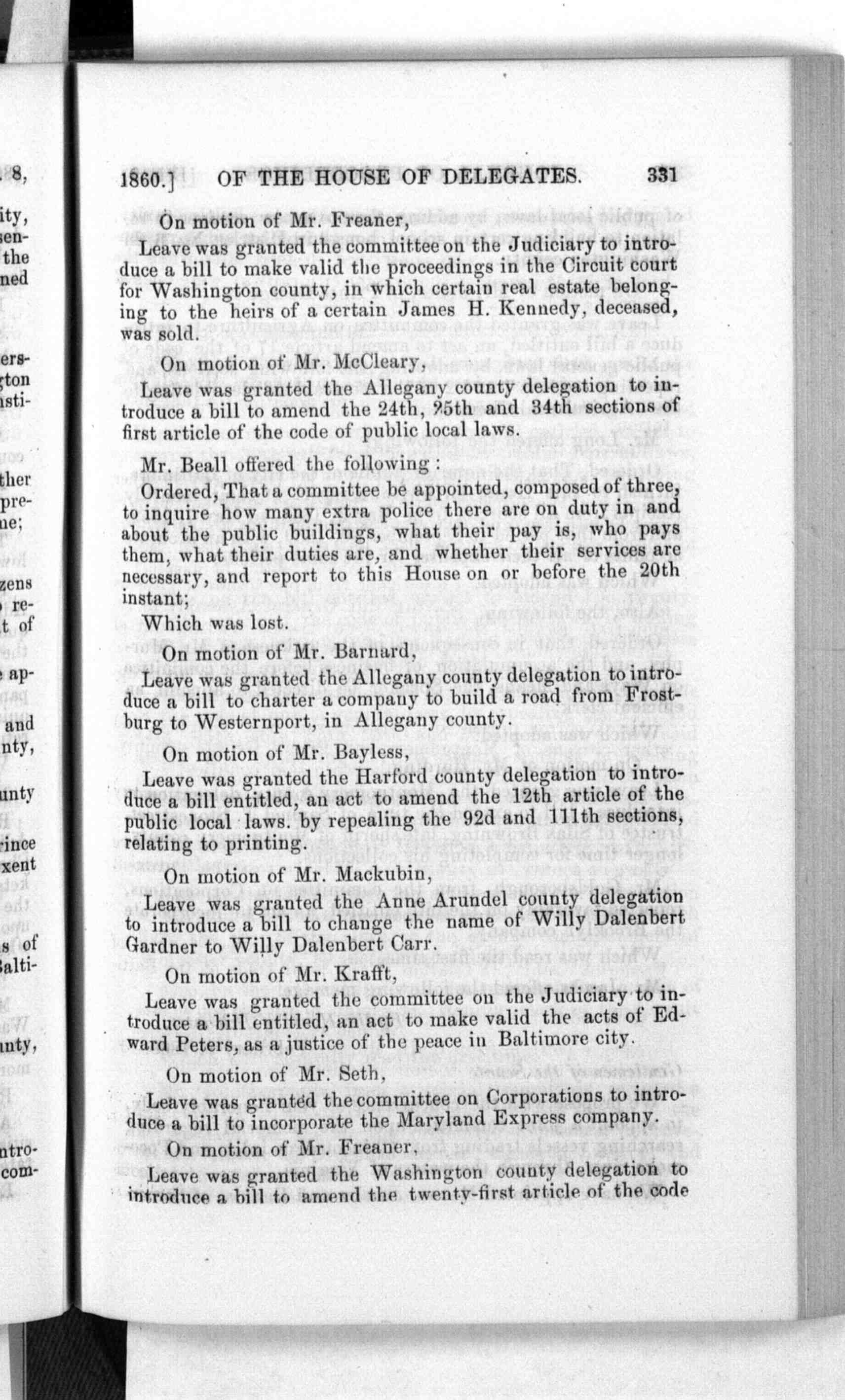 1860.] OF THE HOUSE OF DELEGATES. 331 On motion of Mr. Freaner, Leave was granted the committee on the Judiciary to intro- On motion of Mr. McCleary, Leave was granted the Allegany county delegation to in- Mr. Beall offered the following : Ordered, That a committee be appointed, composed of three, Which was lost. Leave was granted the Allegany county delegation to intro- On motion of Mr. Bayless, Leave was granted the Harford county delegation to intro- On motion of Mr. Mackubin, Leave was granted the Anne Arundel county delegation On motion of Mr. Krafft, Leave was granted the committee on the Judiciary to in- On motion of Mr. Seth, Leave was granted the committee on Corporations to intro- On motion of Mr. Freaner. Leave was granted the Washington county delegation to |