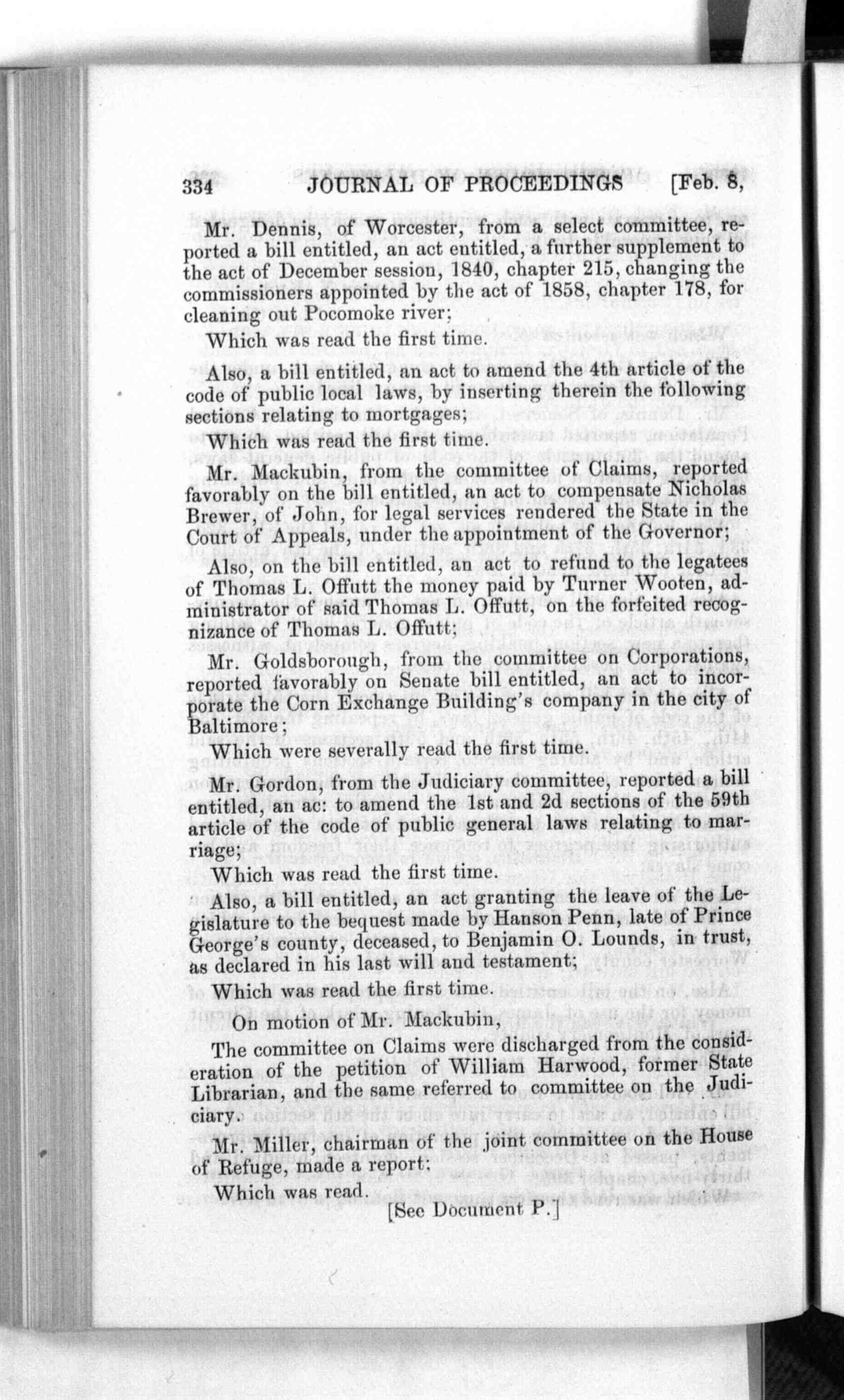 Mr. Dennis, of Worcester, from a select committee, re- Which was read the first time. Also, a bill entitled, an act to amend the 4th article of the Which was read the first time. Mr. Mackubin, from the committee of Claims, reported Also, on the bill entitled, an act to refund to the legatees Mr. Goldsborough, from the committee on Corporations, Which were severally read the first time. Mr. Gordon, from the Judiciary committee, reported a bill Which was read the first time. Also, a bill entitled, an act granting the leave of the Le- Which was read the first time. The committee on Claims were discharged from the consid- Mr. Miller, chairman of the joint committee on the House Which was read. [See Document P.]