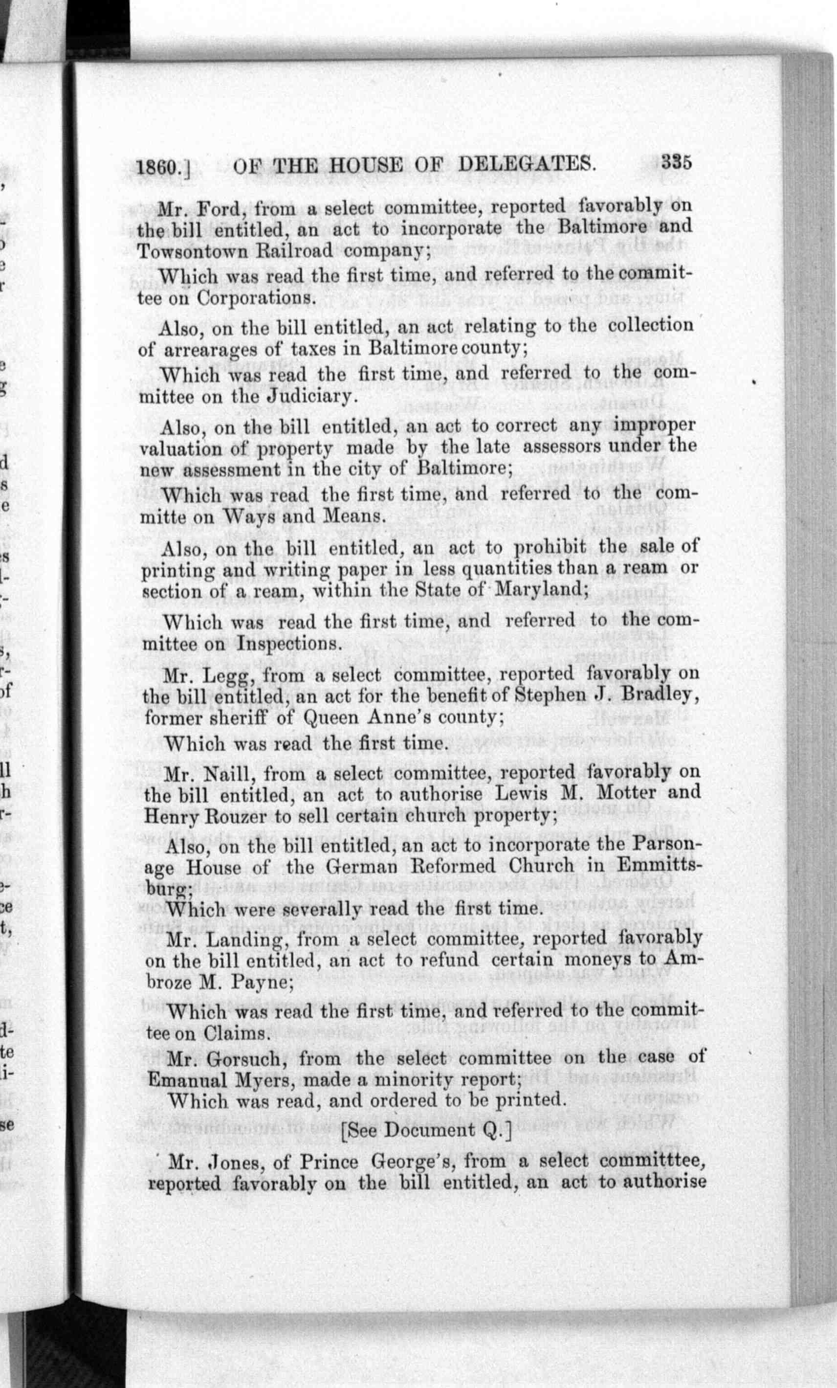 1860.] OF THE HOUSE OF DELEGATES. 335 Mr. Ford, from a select committee, reported favorably on Which was read the first time, and referred to the commit- Also, on the bill entitled, an act relating to the collection Which was read the first time, and referred to the com- Also, on the bill entitled, an act to correct any improper Which was read the first time, and referred to the com- Also, on the bill entitled, an act to prohibit the sale of Which was read the first time, and referred to the com- Mr. Legg, from a select committee, reported favorably on Which was read the first time. Mr. Naill, from a select committee, reported favorably on Also, on the bill entitled, an act to incorporate the Parson- Which were severally read the first time. Mr. Landing, from a select committee, reported favorably Which was read the first time, and referred to the commit- Mr. Gorsuch, from the select committee on the case of [See Document Q.] Mr. Jones, of Prince George's, from a select committee, |