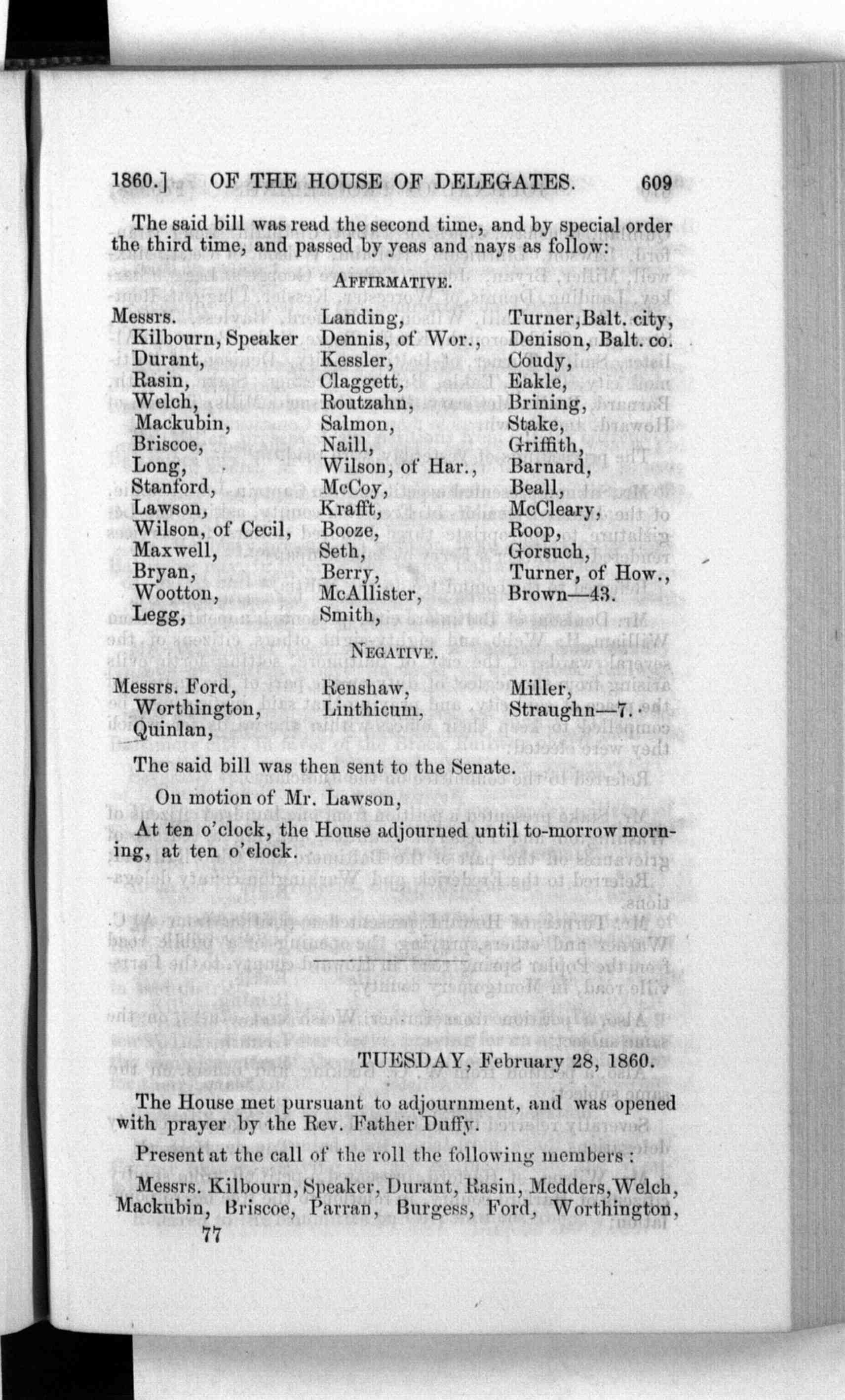 The said bill was then sent to the Senate. At ten o'clock, the House adjourned until to-morrow morn- TUESDAY, February 28, 1860. The House met pursuant to adjournment, and was opened Present at the call of the roll the following members : Messrs. Kilbourn, Speaker. Durant, Rasin, Medders, Welch, |
