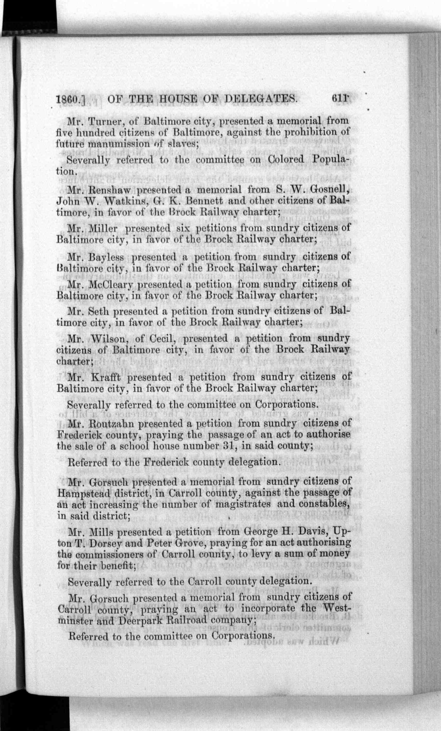 1860.] OF THE HOUSE OF DELEGATES. 611 Mr. Turner, of Baltimore city, presented a memorial from Severally referred to the committee on Colored Popula- Mr. Renshaw presented a memorial from S. W. Gosnell, Mr. Miller presented six petitions from sundry citizens of Mr. Bayless presented a petition from sundry citizens of Mr. McCleary presented a petition from sundry citizens of Mr. Seth presented a petition from sundry citizens of Bal- Mr. Wilson, of Cecil, presented a petition from sundry Mr. Krafft presented a petition from sundry citizens of Severally referred to the committee on Corporations. Mr. Routzahn presented a petition from sundry citizens of Referred to the Frederick county delegation. Mr. Gorsuch presented a memorial from sundry citizens of Mr. Mills presented a petition from George H. Davis, Up- Severally referred to the Carroll county delegation. Mr. Gorsuch presented a memorial from sundry citizens of Referred to the committee on Corporations.