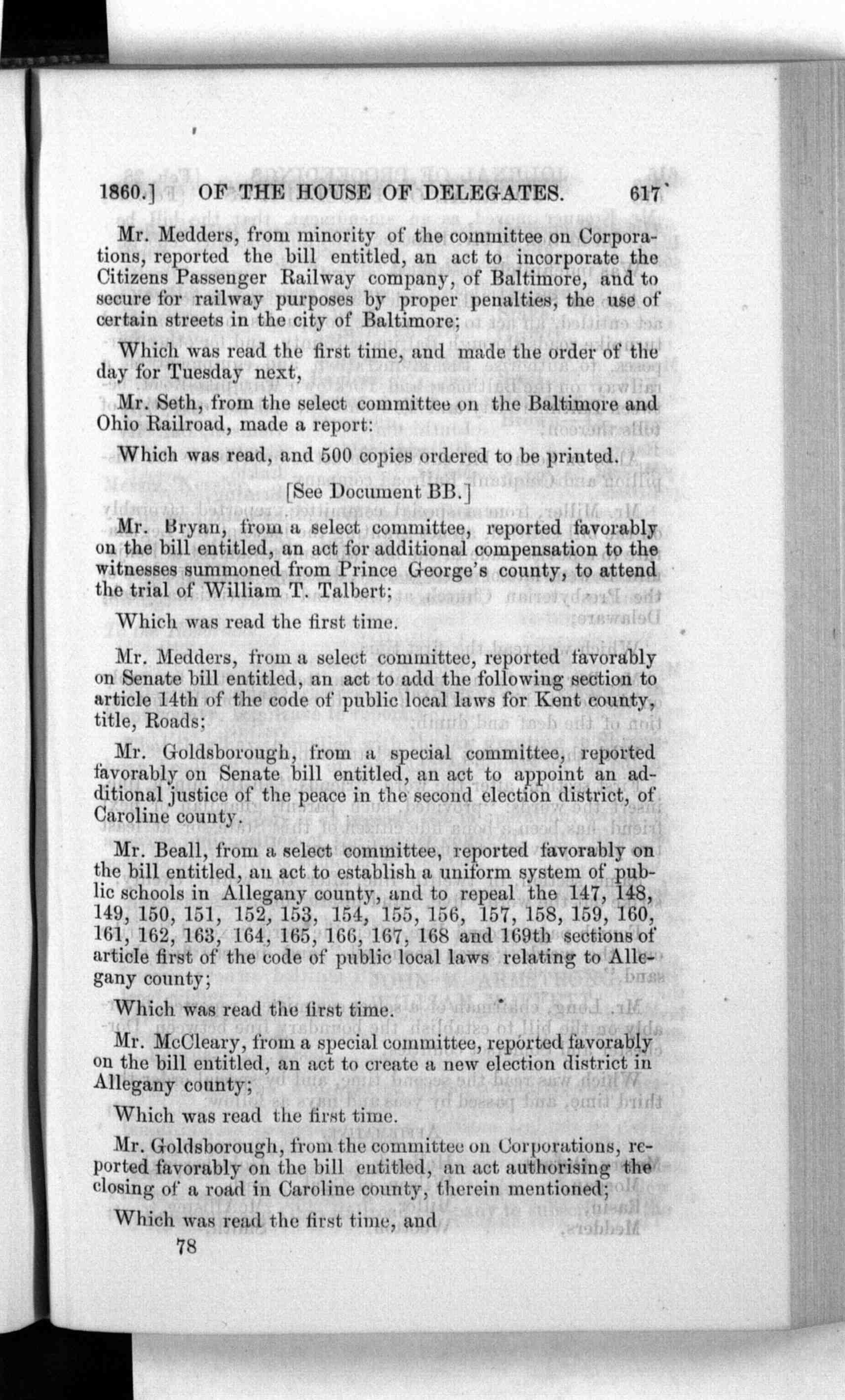 1860.] OF THE HOUSE OF DELEGATES. 617 Mr. Medders, from minority of the committee on Corpora- Which was read the first time, and made the order of the Mr. Seth, from the select committee on the Baltimore and Which was read, and 500 copies ordered to be printed. Mr. Bryan, from a select committee, reported favorably Which was read the first time. Mr. Medders, from a select committee, reported favorably Mr. Goldsborough, from a special committee, reported Mr. Beall, from a select committee, reported favorably on Which was read the first time. Mr. McCleary, from a special committee, reported favorably Which was read the first time. Mr. Goldsborough, from the committee on Corporations, re- Which was read the first time, and