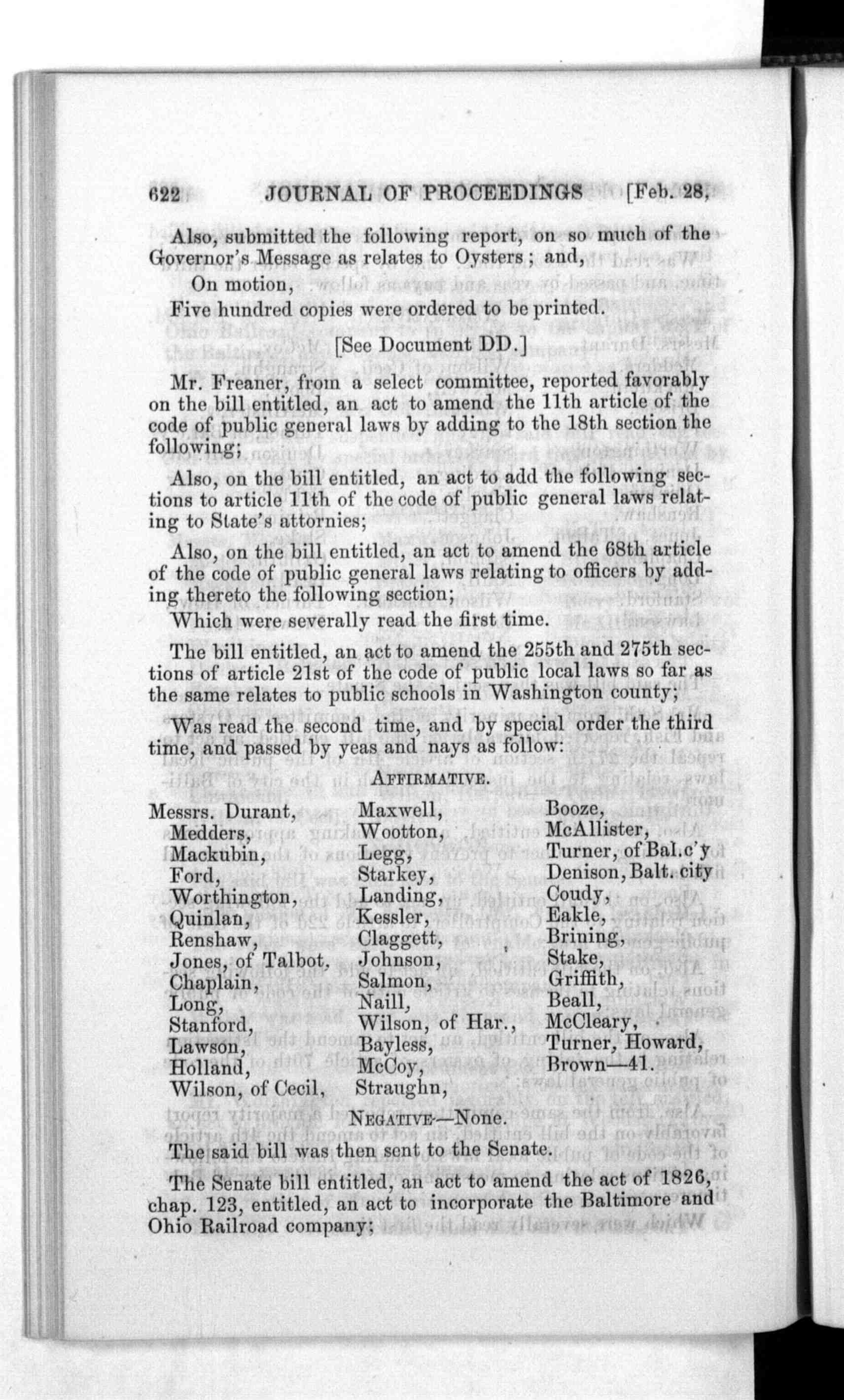 622 JOURNAL OF PROCEEDINGS [Feb. 28, Also, submitted the following report, on so much of the On motion, [See Document DD.] Mr. Freaner, from a select committee, reported favorably Also, on the bill entitled, an act to add the following sec- Also, on the bill entitled, an act to amend the 68th article Which were severally read the first time. The bill entitled, an act to amend the 255th and 275th sec- Was read the second time, and by special order the third