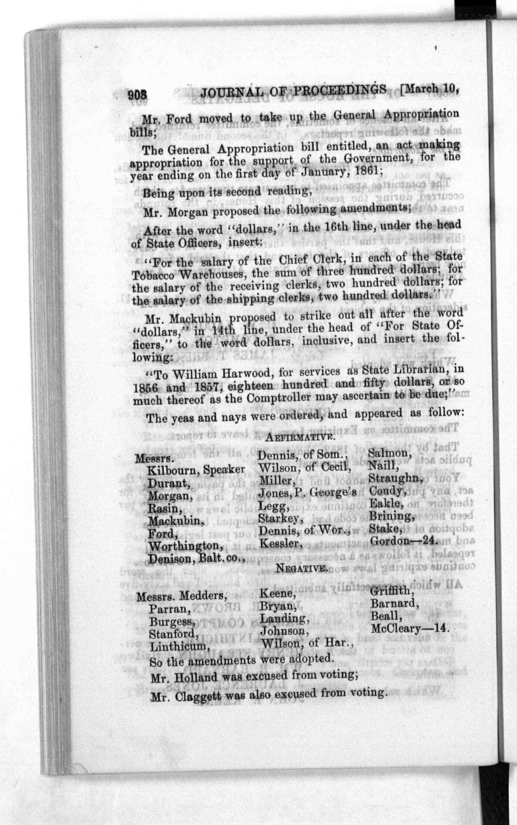 908 JOURNAL OF PROCEEDINGS [March 10, Mr. Ford moved to take up the General Appropriation The General Appropriation bill entitled, an act making Being upon its second reading, Mr. Morgan proposed the following amendments; After the word "dollars," in the 16th line, under the head "For the salary of the Chief Clerk, in each of the State Mr. Mackubin proposed to strike out all after the word "To William Harwood, for services as State Librarian, in The yeas and nays were ordered, and appeared as follow:
