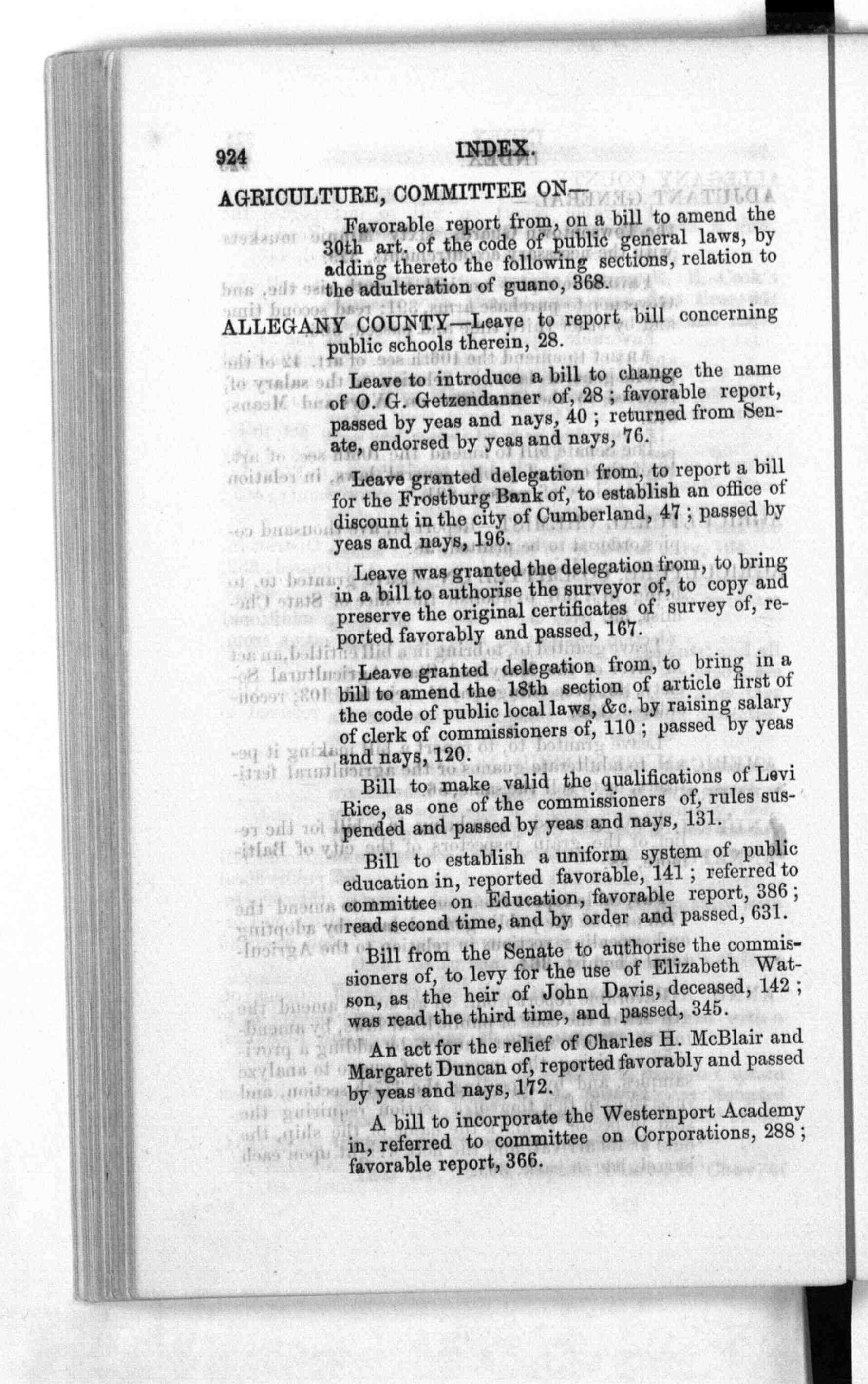 924 INDEX. AGRICULTURE, COMMITTEE ON— Favorable report from, on a bill to amend the 30th art. of the code of public general laws, by the adulteration of guano, 368. ALLEGANY COUNTY—Leave to report bill concerning Leave to introduce a bill to change the name of O. G. Getzendanner of, 28; favorable report, Leave granted delegation from, to report a bill for the Frostburg Bank of, to establish an office of Leave was granted the delegation from, to bring Leave granted delegation from, to bring in a Bill to make valid the qualifications of Levi Bill to establish a uniform system of public Bill from the Senate to authorise the commis- An act for the relief of Charles H. McBlair and A bill to incorporate the Westernport Academy |