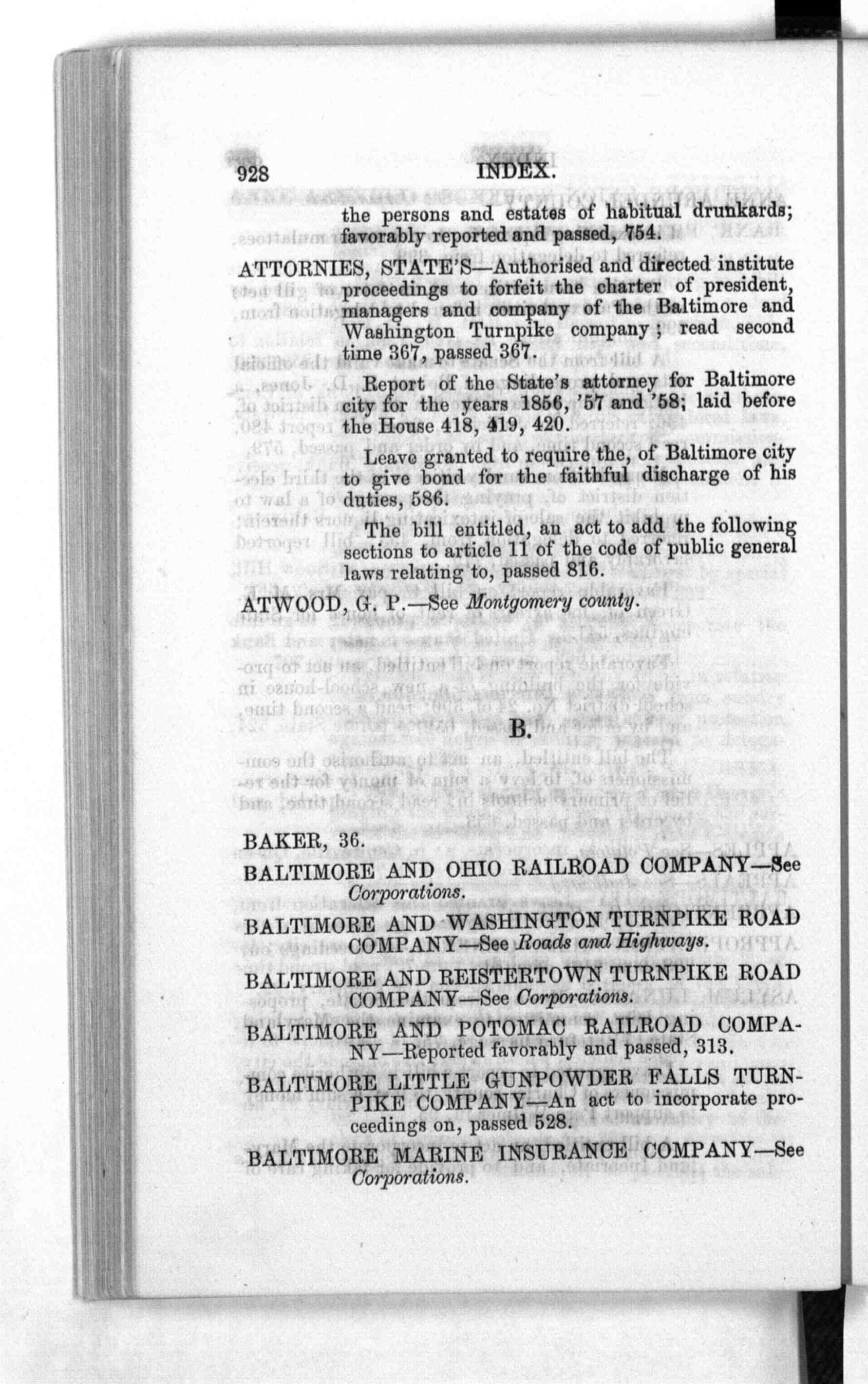 the persons and estates of habitual drunkards; ATTORNIES, STATE'S—Authorised and directed institute time 367, passed 367. Report of the State's attorney for Baltimore Leave granted to require the, of Baltimore city The bill entitled, an act to add the following ATWOOD, G. P.—See Montgomery county. B. BAKER, 36. BALTIMORE AND OHIO RAILROAD COMPANY—See BALTIMORE AND WASHINGTON TURNPIKE ROAD BALTIMORE AND REISTERTOWN TURNPIKE ROAD BALTIMORE AND POTOMAC RAILROAD COMPA- BALTIMORE LITTLE GUNPOWDER FALLS TURN- BALTIMORE MARINE INSURANCE COMPANY—See |