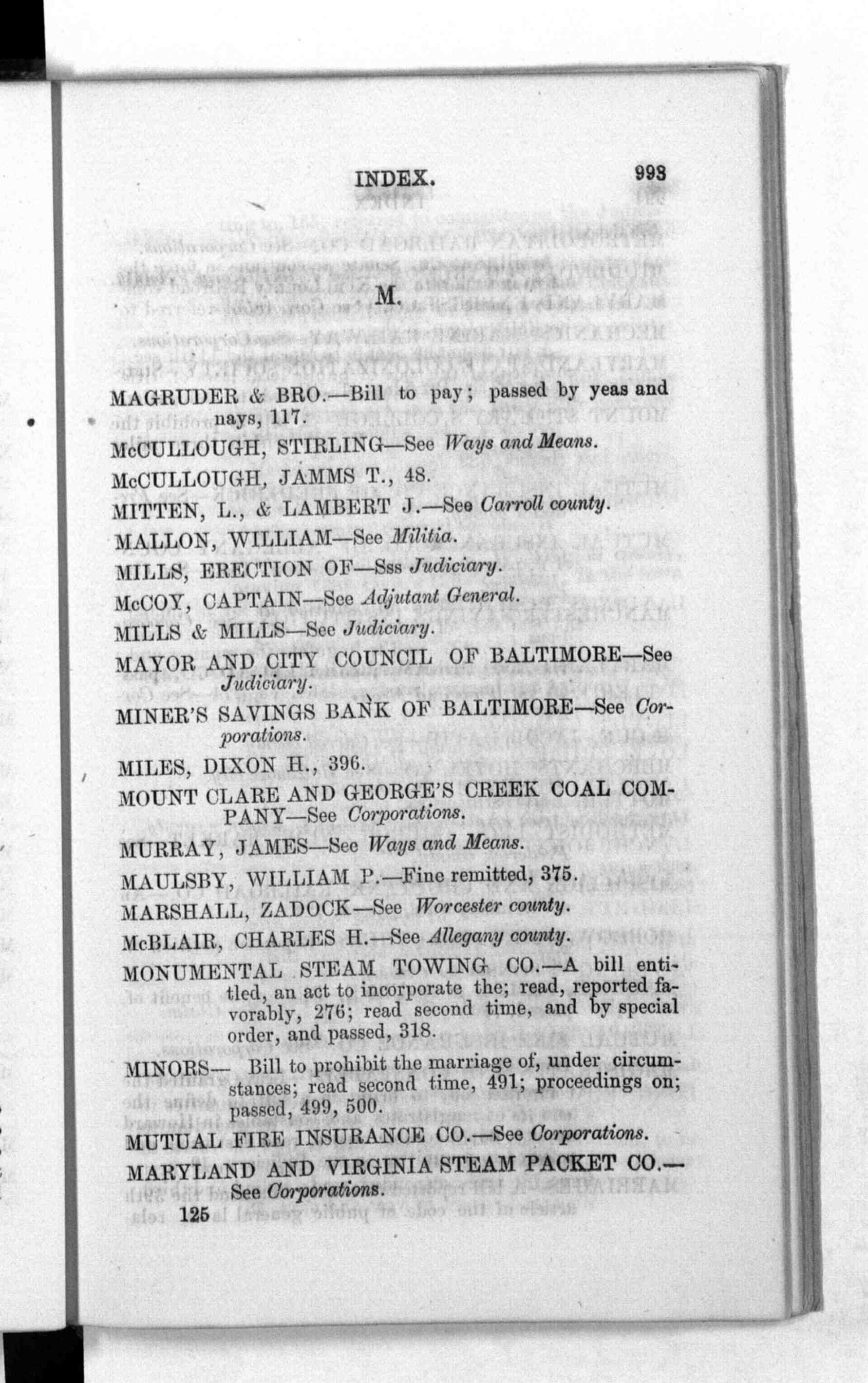 INDEX. 993 M. MAGRUDER & BRO.—Bill to pay; passed by yeas and McCULLOUGH, STIRLING—See Ways and Means. McCULLOUGH, JAMMS T., 48. MITTEN, L., & LAMBERT J.—See Carroll county. MALLON, WILLIAM—See Militia. MILLS, ERECTION OF—See Judiciary. McCOY, CAPTAIN—See Adjutant General. MILLS & MILLS—See Judiciary. MAYOR AND CITY COUNCIL OF BALTIMORE—See Judiciary. MINER'S SAVINGS BANK OF BALTIMORE—See Cor- MILES, DIXON H., 396. MOUNT CLARE AND GEORGE'S CREEK COAL COM- MURRAY, JAMES—See Ways and Means. MONUMENTAL STEAM TOWING CO.—A bill enti- MINORS— Bill to prohibit the marriage of, under circum- MUTUAL FIRE INSURANCE CO.—See Corporations. MARYLAND AND VIRGINIA STEAM PACKET CO.— |