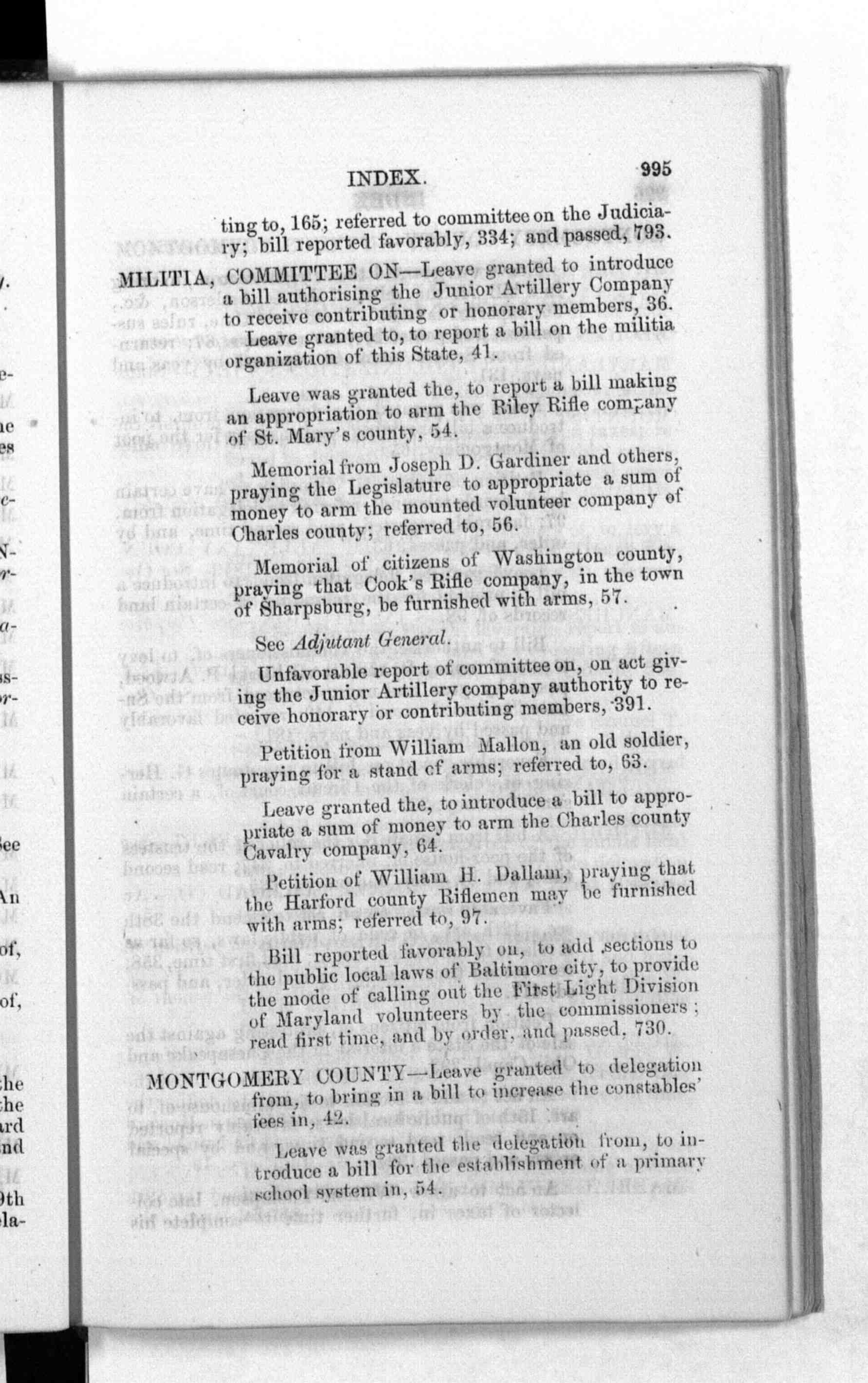 INDEX. 995 ting to, 165; referred to committee on the Judicia- MILITIA.. COMMITTEE ON—Leave granted to introduce a bill authorising the Junior Artillery Company to receive contributing or honorary members, 36. Leave granted to, to report a bill on the militia organization of this State, 41. Leave was granted the, to report a bill making Memorial from Joseph D. Gardiner and others, Memorial of citizens of Washington county, See Adjutant General. Unfavorable report of committee on, on act giv- Petition from William Mallon, an old soldier, Leave granted the, to introduce a bill to appro- Petition of William H. Dallam, praying that Bill reported favorably on, to add .sections to MONTGOMERY COUNTY—Leave granted to delegation Leave was granted the delegation from, to in- |