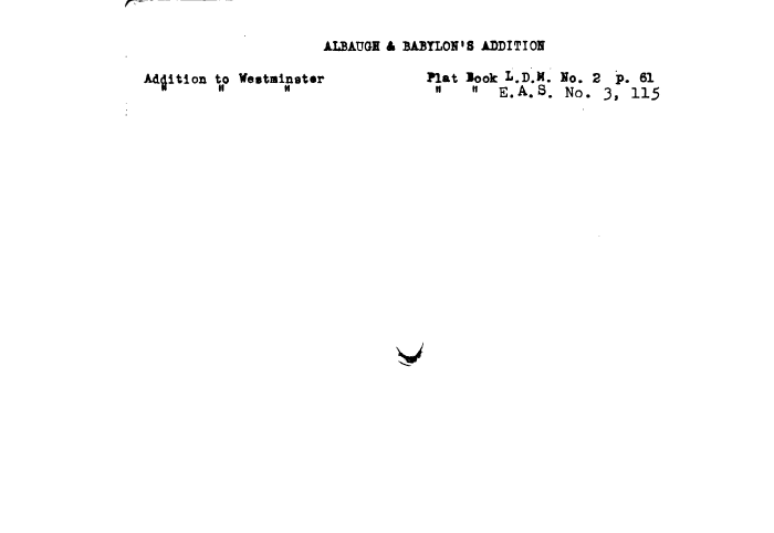 | ALBAUGH A BABYLON'S ADDITION Addition to Westminster Flat look L.D.M. Ho. 2 p. 61 » « « w H E.A.S. No. 3, 115 |
