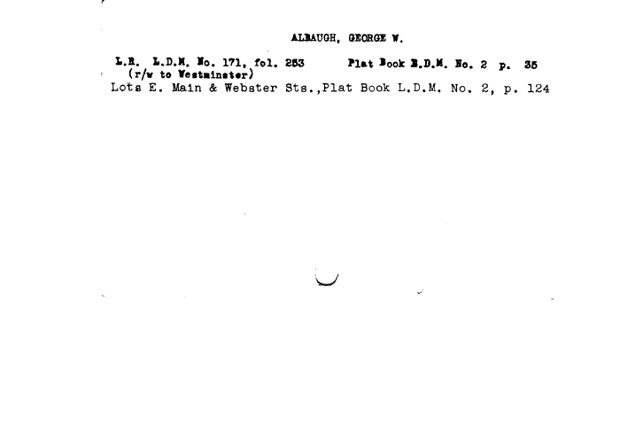 | AL1AUGH, OIOROE W. L.a. XuD.H. Io. 171, fol. 253 Flat >ook l.D.M. Ho. 2 p. 35 (r/v to VettMin«t«r) Lots E. Main & Webster Sts.,Plat Book L.D.M. No, 2, p. 124 |