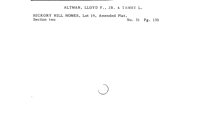 | ALTMAN, LLOYD F., JR. & TAMMY L. HICKORY HILL HOMES, Lot 19, Amended Plat, Section two No. 31 Pg. 133 |