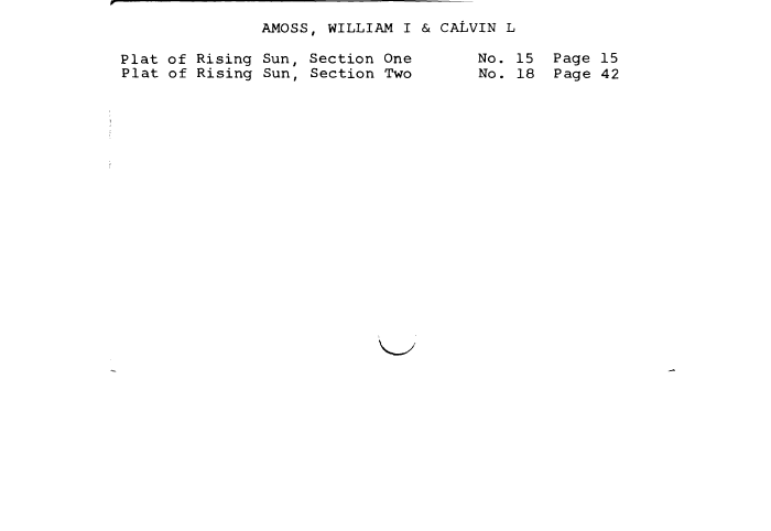 | AMOSS, WILLIAM I & CALVIN L Plat of Rising Sun, Section One No. 15 Page 15 Plat of Rising Sun, Section Two No. 18 Page 42 |