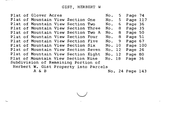| GIST, HERBERT W Plat of Glover Acres No. 5 Page 74 Plat of Mountain View Section One No. 5 Page 117 Plat of Mountain View Section Two No. 6 Page 36 Plat of Mountain View Section Three No. 8 Page 35 Plat of Mountain View Section Two A No. 8 Page 50 Plat of Mountain View Section Four No. 8 Page 51 Plat of Mountain View Section Five No. 9 Page 67 Plat of Mountain View Section Six No. 10 Page 100 Plat of Mountain View Section Seven No. 12 Page 26 Plat of Mountain View Section Eight No. 12 Page 80 Plat of Mountain View Section Nine No. 18 Page 36 Subdivision of Remaining Portion of Herbert W. Gist Property into Parcels A & B No. 24 Page 143 |