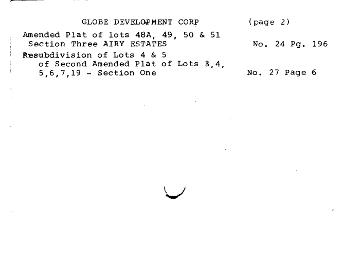 | GLOBE DEVELOPMENT CORP (page 2) Amended Plat of lots 48A, 49, 50 & 51 Section Three AIRY ESTATES No. 24 Pg. 196 Resubdivision of Lots 4 & 5 of Second Amended Plat of Lots 3,4, 5,6,7,19 - Section One No. 27 Page 6 |