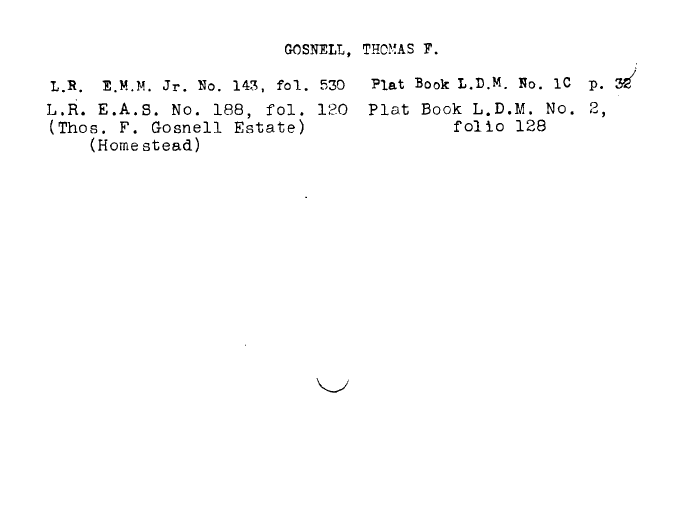 | GOSN1LL, THOMAS F. L.H. E.M.M. Jr. No. 143, fol. 530 Plat Book L.D.M. Ho. 1C p. L.R. E.A.S. No. 188, fol. 120 Plat Book L.D.M. No. 2, (Thos. F. G-osnell Estate) folio 128 (Home stead) |