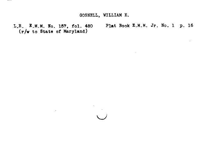 | GOSNELL, WILLIAM E. L.R. Z.M.M. No. 167. fol. 480 Plat Book I.M.M. Jr. No. 1 p. 16 (r/w to State of Maryland) |