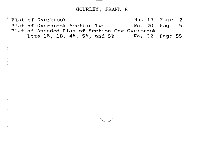 | GOURLEY, FRANK R Plat of Overbrook No. 15 Page 2 Plat of Overbrook Section Two No. 20 Page 5 Plat of Amended Plan of Section One Overbrook Lots 1A, IB, 4A, 5A, and 5B No. 22 Page 55 |