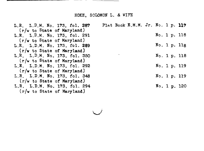 | HOKE, SOLOMON L. & WIFE L.H. L.D.M. No. 173, fol. 287 Plat Book E.M.M. Jr. No. 1 p. 11? (r/w to State of Maryland) L.E. L.D.M. No. 173, fol. 291 No. 1 p. 118 (r/w to State of Maryland) L.R. L.D.M. No. 173, fol. 289 NO. 1 P- 11-8 (r/w to State of Maryland) L.R. L.D.M. No. 173, fol. 350 ' No. 1 p. 118 (r/w to State of Maryland) L.R. L.D.M. No. 173, fol. 292 No. 1 p. 119 (r/w to State of Maryland) L.R. L.D.M. No. 173, fol. 348 No. 1 p. 119 (r/w to State of Maryland) L.R. L.D.M. No. 173, fol. 294 No. 1 p. 120 (r/w to State of Maryland) |