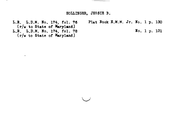 | HOLLIHGEH, JESSIE B. L.H. L.D.M. No. 174, fol. 76 Plat Book Z.M.M. Jr. Ho. 1 p. 130 (r/v to State of Maryland) L.H. L.D.M. Ho. 174, fol. 78 Ho. 1 p. 131 (r/w to State of Maryland) |