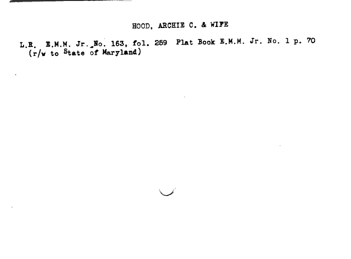 | HOOD, ARCHIE C. & WITE L.R. B.M.M. Jr. JJo. 163, fol. 269 Plat Book E.M.M. Jr. No. 1 p. 70 (r/w to state of Maryland) |