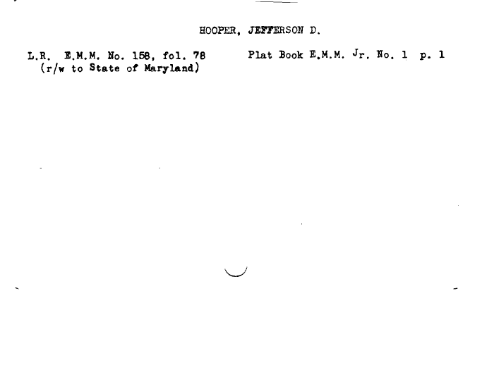 | HOOPER, JEFFERSON D. L.R. E.M.M. Ho. 168, fol. 78 Plat Book E.M.M. JT. Ho. 1 p. 1 (r/w to State of Maryland) |