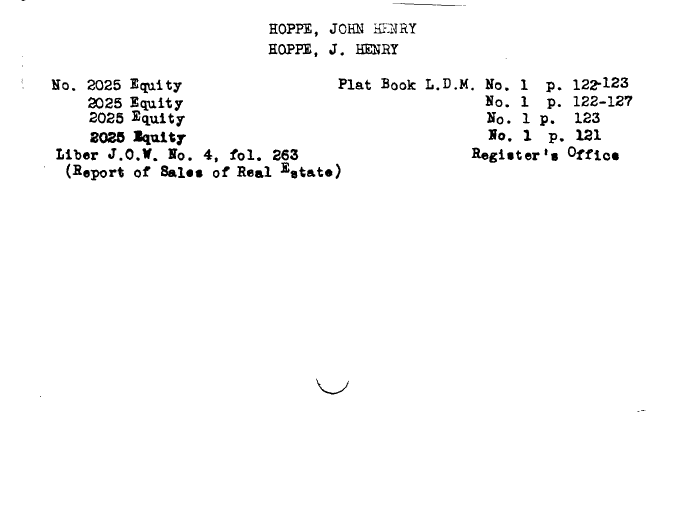| HOPPE, JOHN HENRY HOPPE, J. HENHY Ho. 2025 Equity Plat B00k L.D.M. Ho. 1 p. 122-123 2025 Equity So. 1 p. 122-127 2025 Equity No. 1 p. 123 8025 Iqulty Ho. 1 p. 121 Liber J.O.W. Ho. 4, fol. 263 Register's Office (Report of Sales of Real £stat«) |