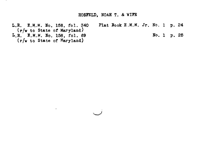 | HOSIELD, NOAH T. & WIPE L.H. E.M.M. Ho. 158, fol. 340 Plat BookE.M.M. Jr. No. 1 p. 24 (r/w to State of Maryland) L.H. l.M.M. No. 158, fol. 69 No. 1 p. 25 (r/w to State of Maryland) |
