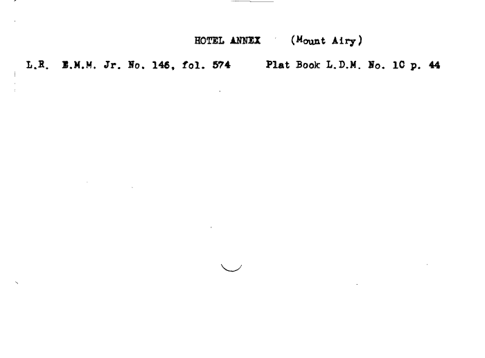 | HOTEL ANNZX (Mount Airy) L.B. l.M.M. Jr. Ho. 146, fol. 574 Plat Book L.D.M. Ho. 1C p. 44 |
