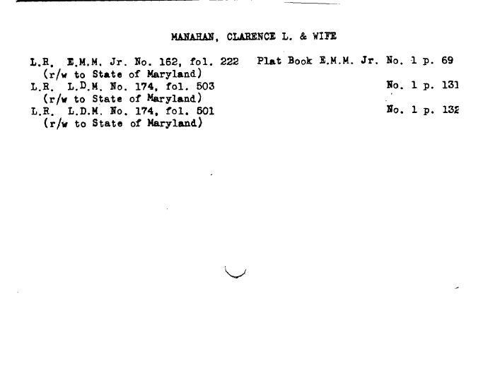 | MAHAHAN, CLARENCE L. & WIFE L.fi. I.M.M. Jr. No. 162, fol. 222 Plat Book E.M.M. Jr. Ho. 1 p. 69 (r/w to State of Maryland) L.R. L.D.M. No. 174, fol. 503 No. 1 p. 131 (r/w to State of Maryland) L.R. L.D.M. No. 174, fol. 501 No. 1 p. 132 (r/w to State of Maryland) |