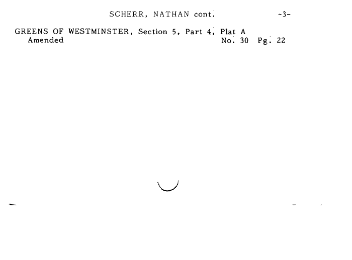 | SCHERR, NATHAN cont. -3- GREENS OF WESTMINSTER, Section 5, Part 4, Plat A Amended No. 30 Pg. 22 |
