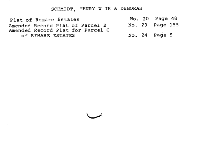 | SCHMIDT, HENRY W JR & DEBORAH Plat of Remare Estates No. 20 Page 48 Amended Record Plat of Parcel B No. 23 Page 155 Amended Record Plat for Parcel C of REMARE ESTATES No. 24 Page 5 |