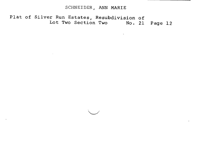 | SCHNEIDER, ANN MARIE Plat of Silver Run Estates, Resubdivision of Lot Two Section Two No. 21 Page 12 |