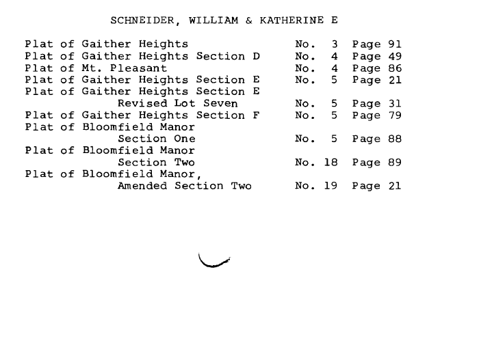 | SCHNEIDER, WILLIAM & KATHERINE E Plat of Gaither Heights No. 3 Page 91 Plat of Gaither Heights Section D No. 4 Page 49 Plat of Mt. Pleasant No. 4 Page 86 Plat of Gaither Heights Section E No. 5 Page 21 Plat of Gaither Heights Section E Revised Lot Seven No. 5 Page 31 Plat of Gaither Heights Section F No. 5 Page 79 Plat of Bloomfield Manor Section One No. 5 Page 88 Plat of Bloomfield Manor Section Two No. 18 Page 89 Plat of Bloomfield Manor, Amended Section Two No. 19 Page 21 |
