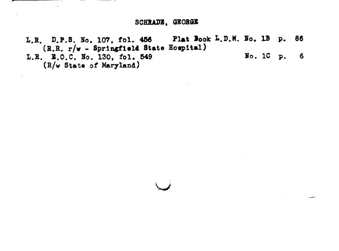 | SCHBAOT, (HORSE L.H. D.P.8. Ho. 107, fol. 456 Plat look I.D.M. Ho. IB p. 66 (H.R. r/v - Springfield State Hotpltal) L.R. B.O.C. Ho. ISO, fol. 649 Ho. 1C p. 6 (R/w State of Maryland) |