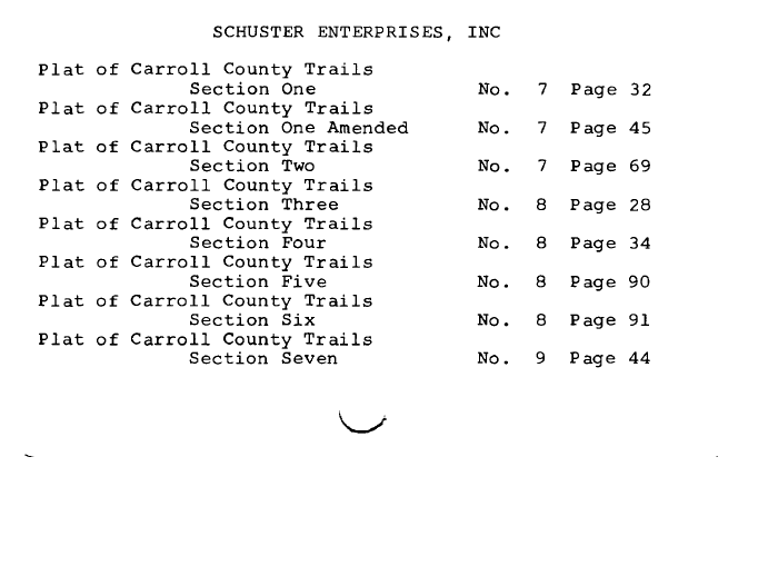 | SCHUSTER ENTERPRISES, INC Plat of Carroll County Trails Section One No. 7 Page 32 Plat of Carroll County Trails Section One Amended No. 7 Page 45 Plat of Carroll County Trails Section Two No. 7 Page 69 Plat of Carroll County Trails Section Three No. 8 Page 28 Plat of Carroll County Trails Section Four No. 8 Page 34 Plat of Carroll County Trails Section Five No. 8 Page 90 Plat of Carroll County Trails Section Six No. 8 Page 91 Plat of Carroll County Trails Section Seven No. 9 Page 44 |