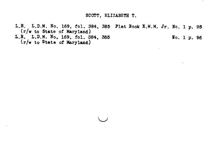 | SCOTT, ELIZABETH T. L.B. L.D.M. No. 169, fol. 384, 385 Plat Book E.M.M. Jr. No. 1 p. 95 (r/w to State of Maryland) L.B. L.D.M. No. 169, fol. 384, 385 No. 1 p. 96 (r/w to State of Maryland) |