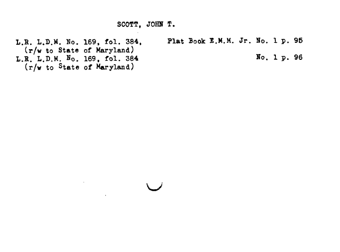 | SCOTT, JOHN T. L.B. L.D.M. Mo. 169, fol. 384, Plat Book Z.M.M. Jr. No. 1 p. 95 (r/w to State of Maryland) L.R. L.D.M. N0. 169, fol. 384 No. 1 p. 96 (r/w to State of Maryland) |