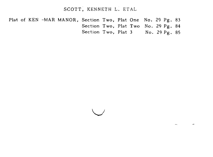 | SCOTT, KENNETH L. ETAL Plat of KEN -MAR MANOR, Section Two, Plat One No. 29 Pg. 83 Section Two, Plat Two No. 29 Pg. 84 Section Two, Plat 3 No. 29 Pg. 85 |