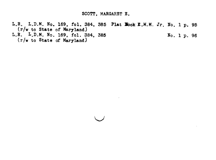 | SCOTT, MARGARET E. L.R. L.D.M. No. 169, fol. 384. 385 Plat lookZ.M.M. Jr. Ho. 1 p. 95 (r/w to State of Maryland) L.B. L.D.M. No. 169, fol. 384, 385 No. 1 p. 96 (r/w to State of Maryland) |