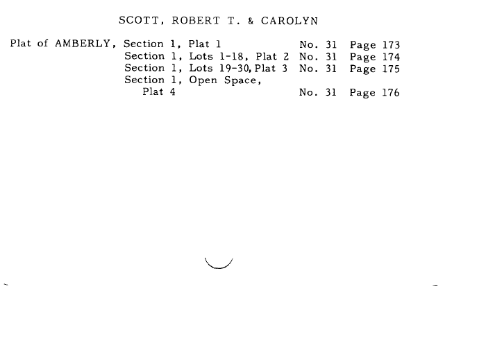 | SCOTT, ROBERT T. & CAROLYN Plat of AMBERLY, Section 1, Plat 1 No. 31 Page 173 Section 1, Lots 1-18, Plat 2 No. 31 Page 174 Section 1, Lots 19-30, Plat 3 No. 31 Page 175 Section 1, Open Space, Plat 4 No. 31 Page 176 |