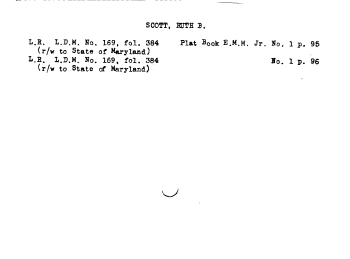 | SCOTT, HJTH B. L.H. L.D.M. No. 169, fol. 384 Plat B00fc E.M.M. Jr. No. 1 p. 95 (r/w to State of Maryland) L.H. L.D.M. No. 169, fol. 384 Ho. 1 p. 96 (r/w to State of Maryland) |